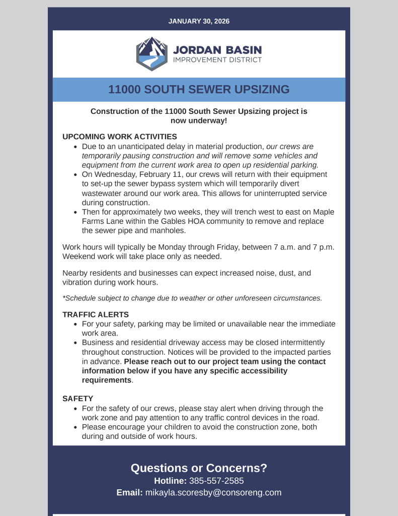 We are excited to announce that South Valley Sewer District has changed its name to Jordan Basin Improvement District.